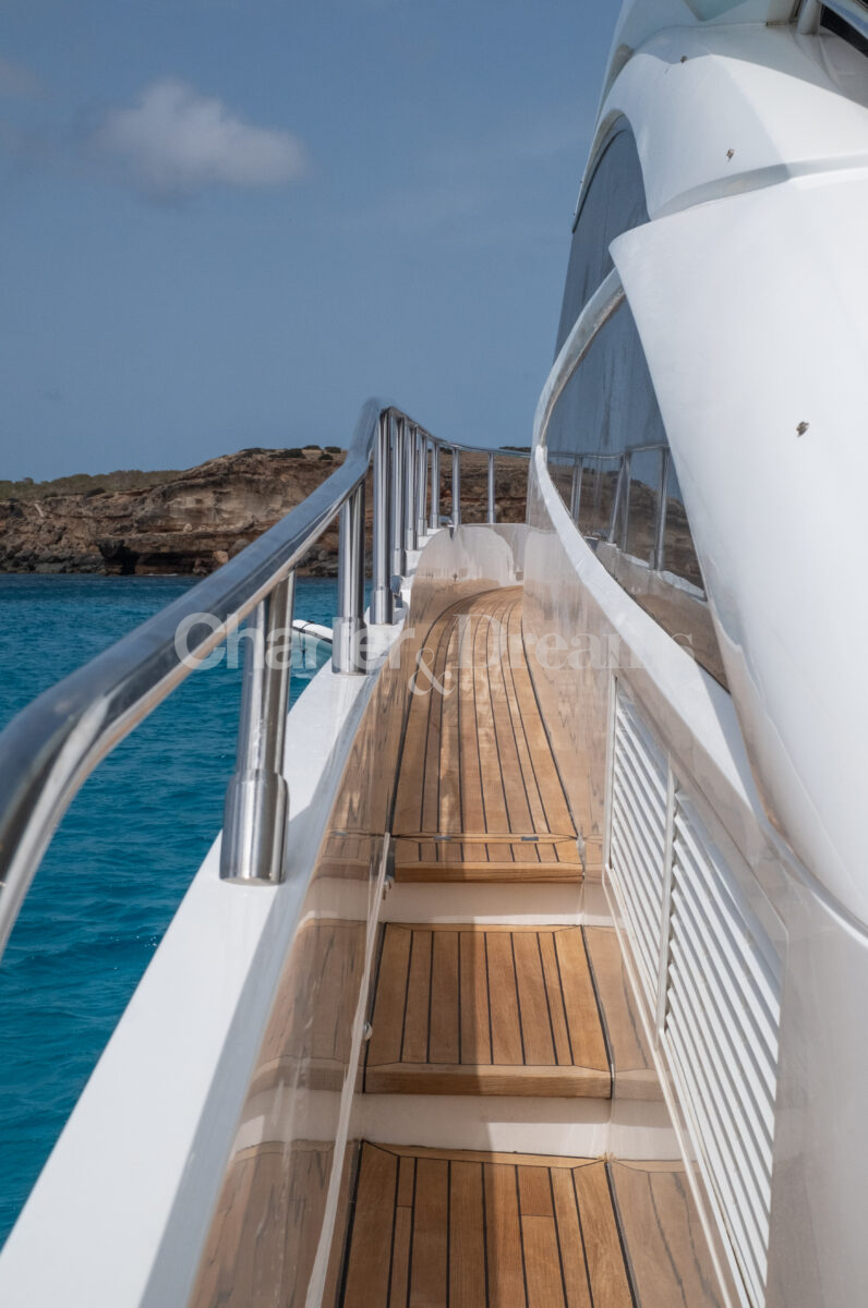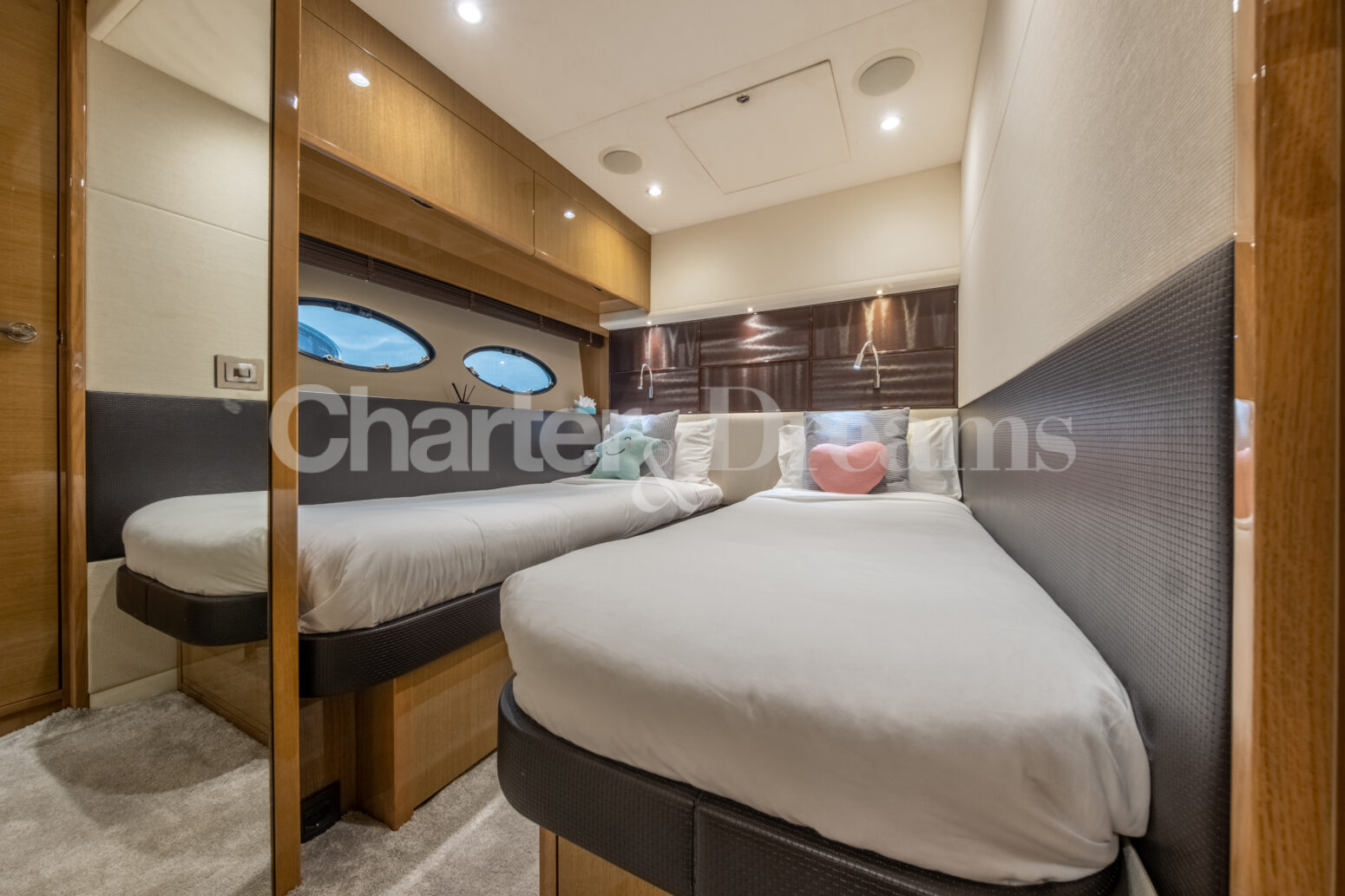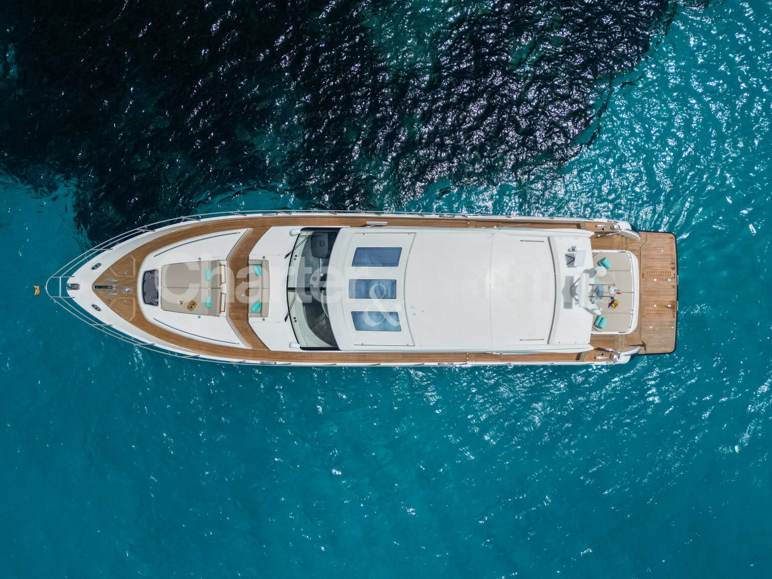 BLISS is a Princess V72 that pairs British engineering with a clean, contemporary style—sleek outside, calm and refined within. At 24 m × 6 m, she moves smartly (22-kn cruise, 38-kn top) on twin Caterpillar 2 × 1,800 CV. Daytime she welcomes up to 12 guests (plus crew), while at night she sleeps 6 across three cabins: a full-beam Master amidships, a bright VIP forward, and a twin with beds convertible to a double; three bathrooms keep everything effortless. The main salon opens completely to the cockpit via disappearing glass doors, blurring indoors and out. On deck, a forward sunpad with U-sofa and table catches the breeze, and aft a generous dining area sits beside a wide sunbed. Comfort is dialed in with stabilizers, Starlink internet, full air-conditioning, an audio system with DJ connection, and retractable awnings fore and aft.