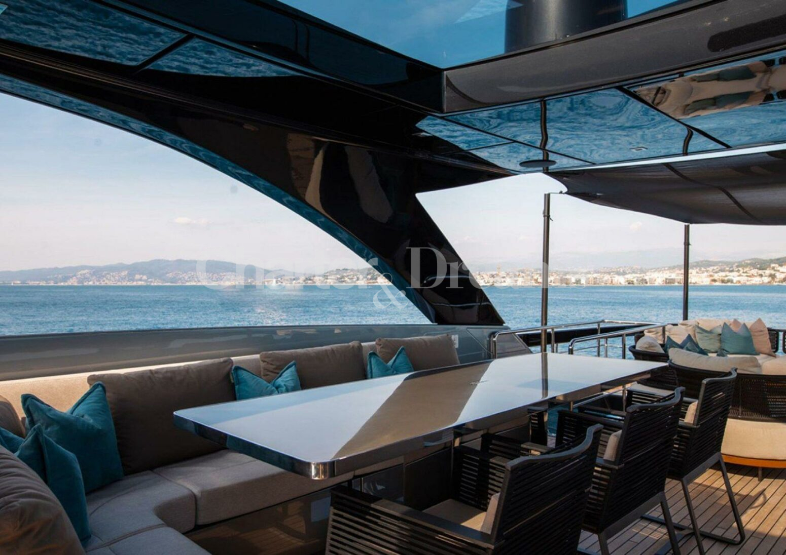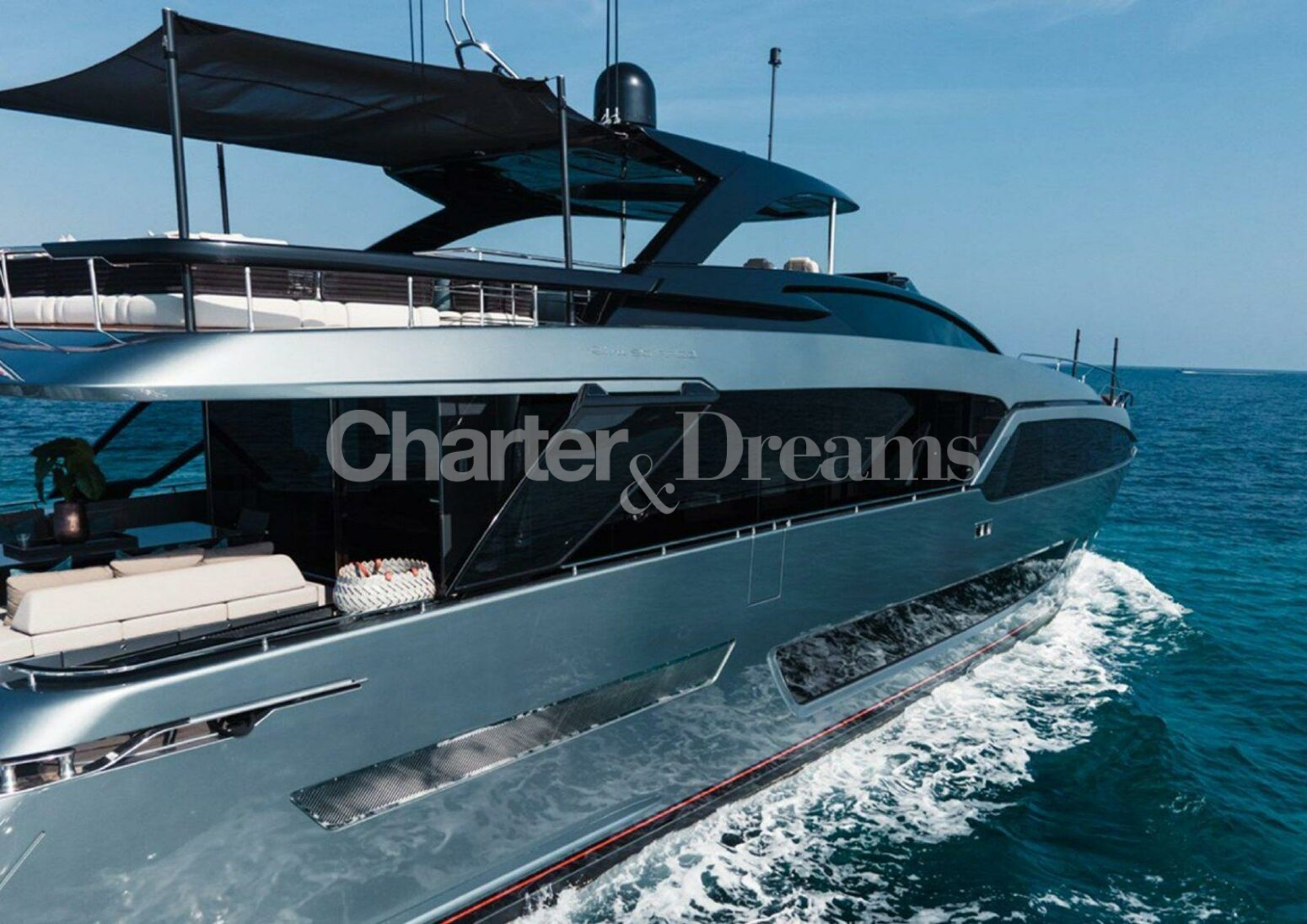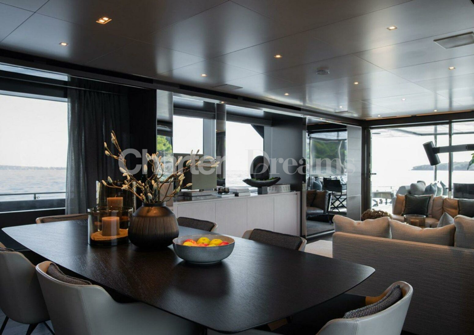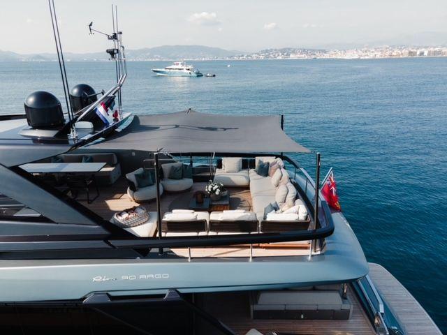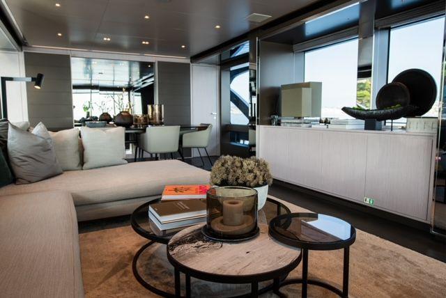 ELLA can accommodate 8 guests in her 4 double cabins; a very spacious master cabin on the main deck. On the lower deck, there is a VIP cabin, a double cabin, and a twin cabin with 2 separate beds that can be converted into a double, all with ensuite bathrooms. On the main deck, we find the dining room and saloon, a living area with sliding doors leading to the aft outdoor area for alfresco dining or breakfast. ELLA ‘s flybridge is elegantly integrated into her superstructure, with glass panels that gently arch from bow to stern. This beautiful open-air space includes a private bar area that has been designed to work around it – whether enjoying a morning coffee or a cocktail – and all other furnishings can be moved aside to make room for morning workouts or an open dance floor for the entire yacht party.