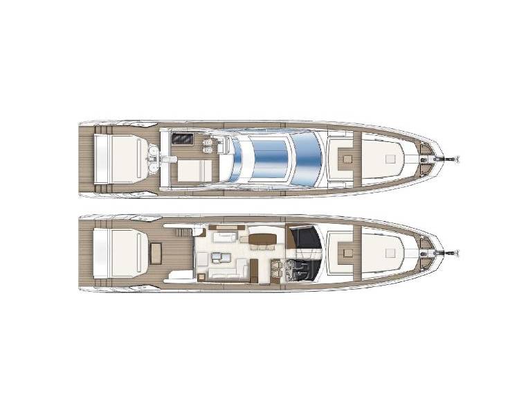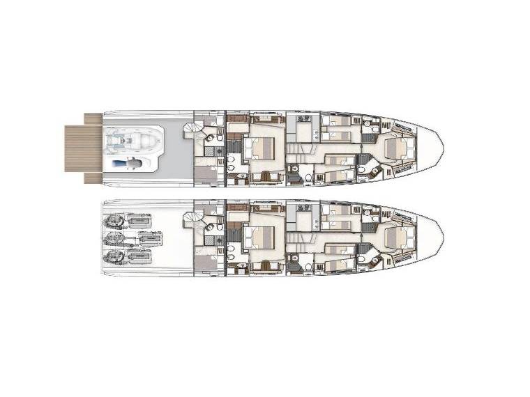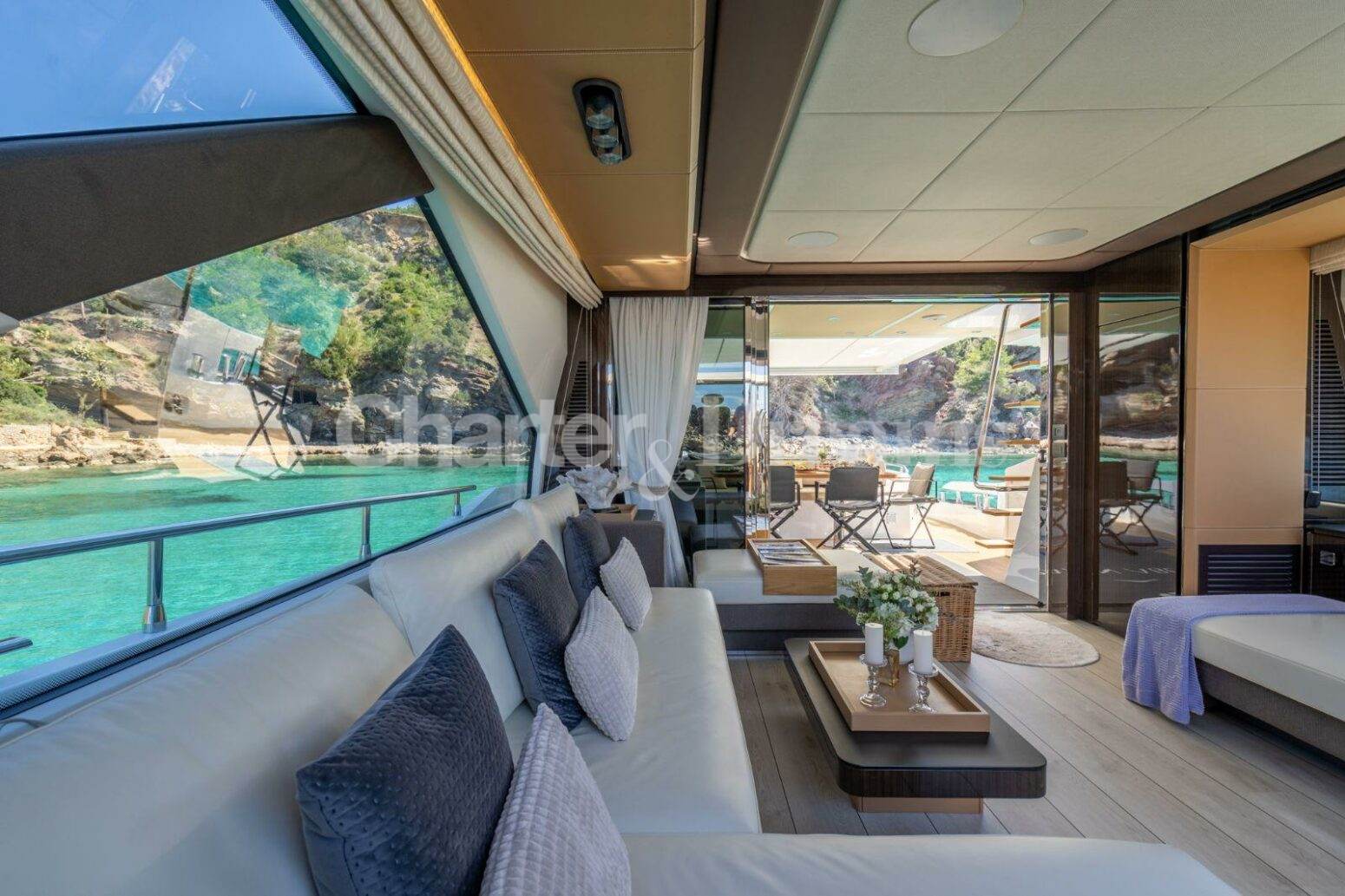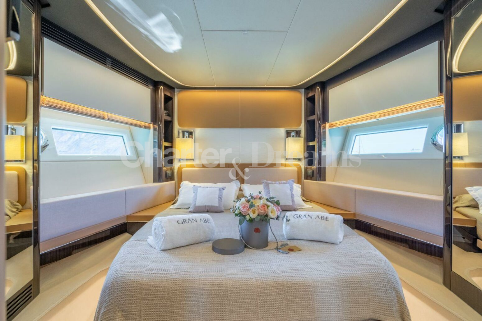 ACCOMODATION & DECK AREAS GRAN ABE II has a sleek and modern interior and can comfortably accommodate up to 9 guests in 4 en-suite cabins, including a master cabin, a VIP cabin and two twin cabins. The master stateroom covers the entire beam with a desk and sofa, the VIP stateroom is located forward with plenty of natural light, and of the two twin staterooms, one has an extra berth. The yacht features a sophisticated exterior design by Stefano Righini and a charming interior design by Carlo Galeazzi. Generous sunbathing areas on the bow, aft and fly bridge. The garage door opens up hydraulically, creating a very spacious “beach club” area with reclining deckchairs, perfect for an afternoon of water sports or an evening cocktail. Inside, the saloon features large windows that allow you to enjoy the natural light while relaxing on the L-shaped sofa.