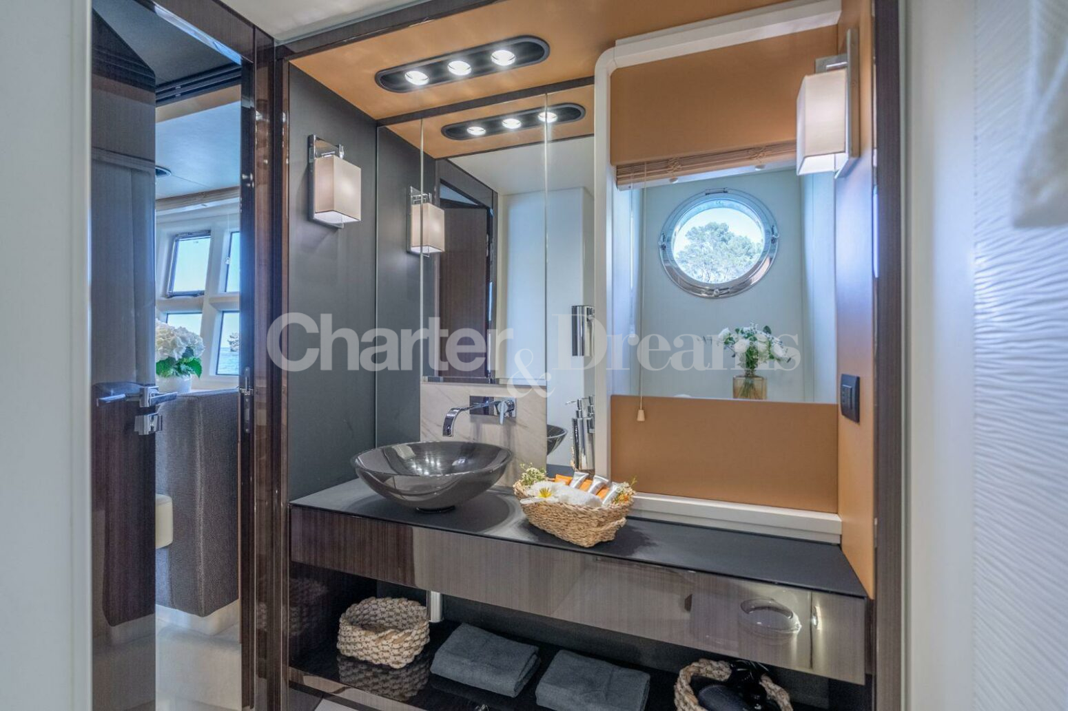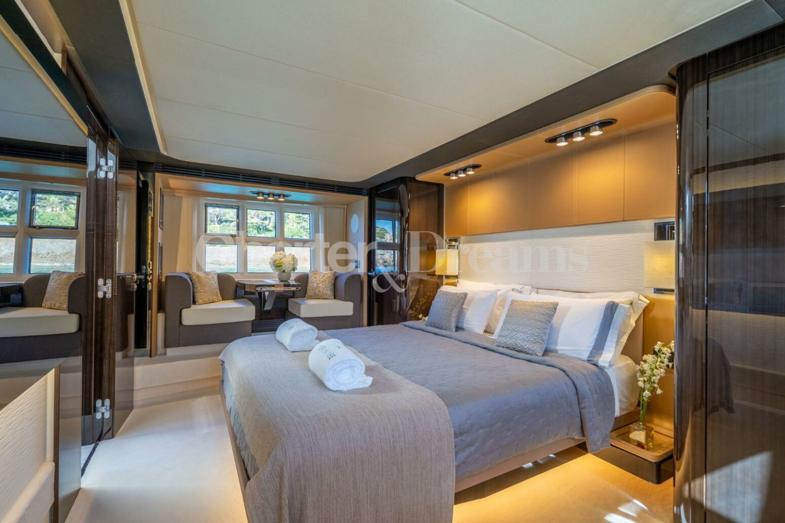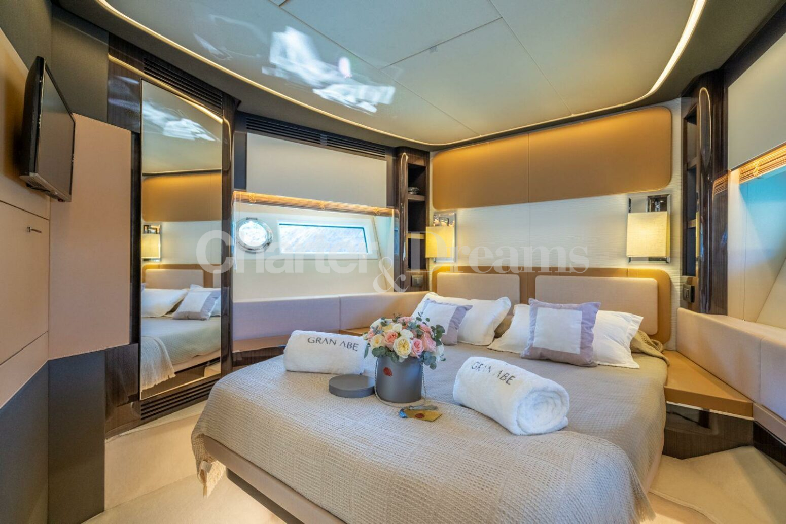 Built with a GRP hull and GRP superstructure, GRAN ABE II has impressive speed and great efficiency thanks to her planing hull. Powered by 3 Volvo D13-9001200 IPS engines, she comfortably cruises at 28 knots and reaches a maximum speed of 35 knots.