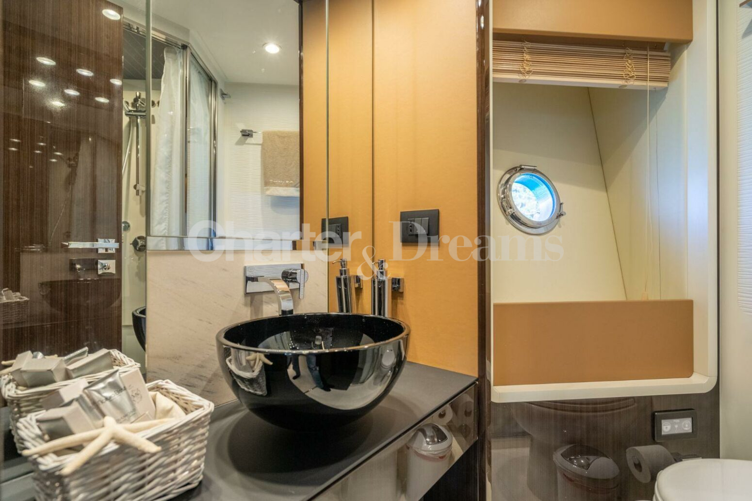 This Azimut is fully equipped with all the necessary electronics. She is even fitted with stabilisers to ensure a calm ambience when out at sea.