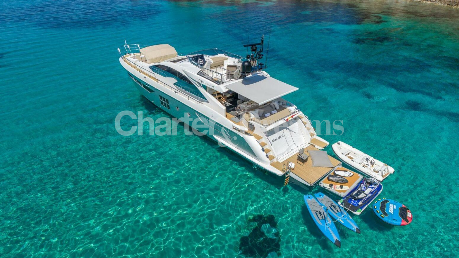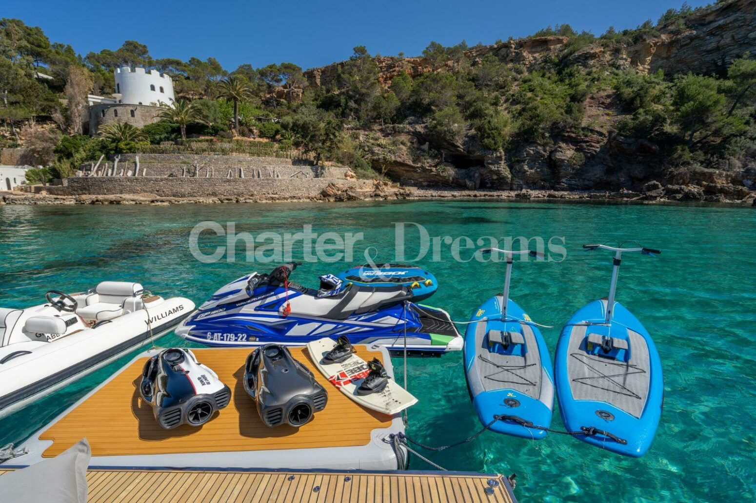 GRAN ABE II has great garage space for the tender and water toys! This yacht comes with a Williams 385 tender, a jetski, two seabobs, two hobbie mirage eclipse pedalboards and an inflatable platform. Enjoy your summers with this fabulous yacht.