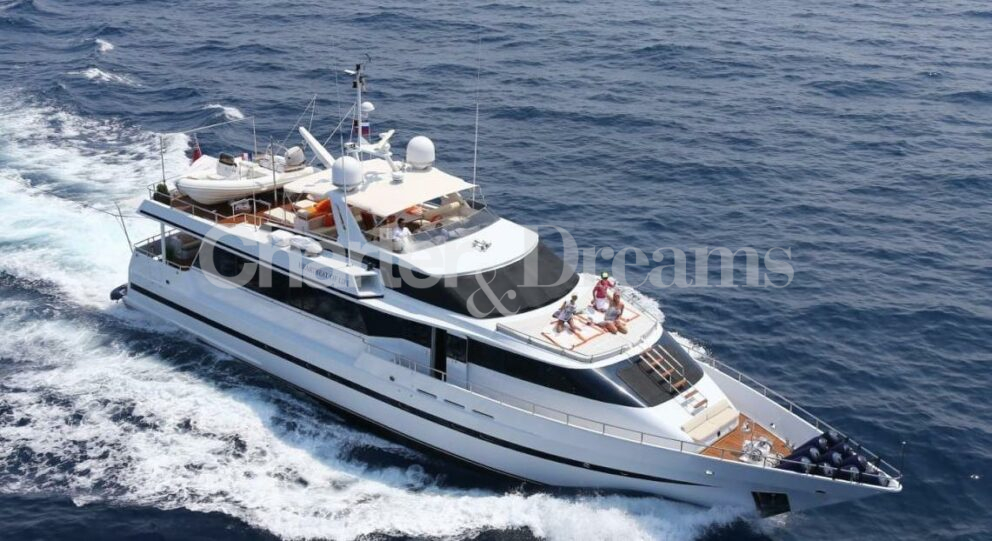 Her sleek exterior is the work of Mulder Design, while her interior has been elegantly appointed by Art Line, featuring luxurious touches such as Versace textiles and Loro Piana cashmere. The yacht boasts a spacious salon with seamless flow to the deck, creating an ideal setting for socializing, dining, or simply unwinding.