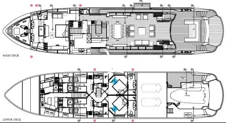 Engines: 2 x MTU M94 (16V 2000) - Generators: 2 x Kholer 70 KW - - Fuel consumption approx excluding generator: - - Economic speed 11 knots - Fuel consumption at economic speed: 130L/H - - Cruising speed 13 knots - Fuel consumption at cruising speed: 250 L/H - - Max speed 24 knots - Fuel consumption at max speed: 1015 L/H - - Generator fuel consumption: 15 L/H