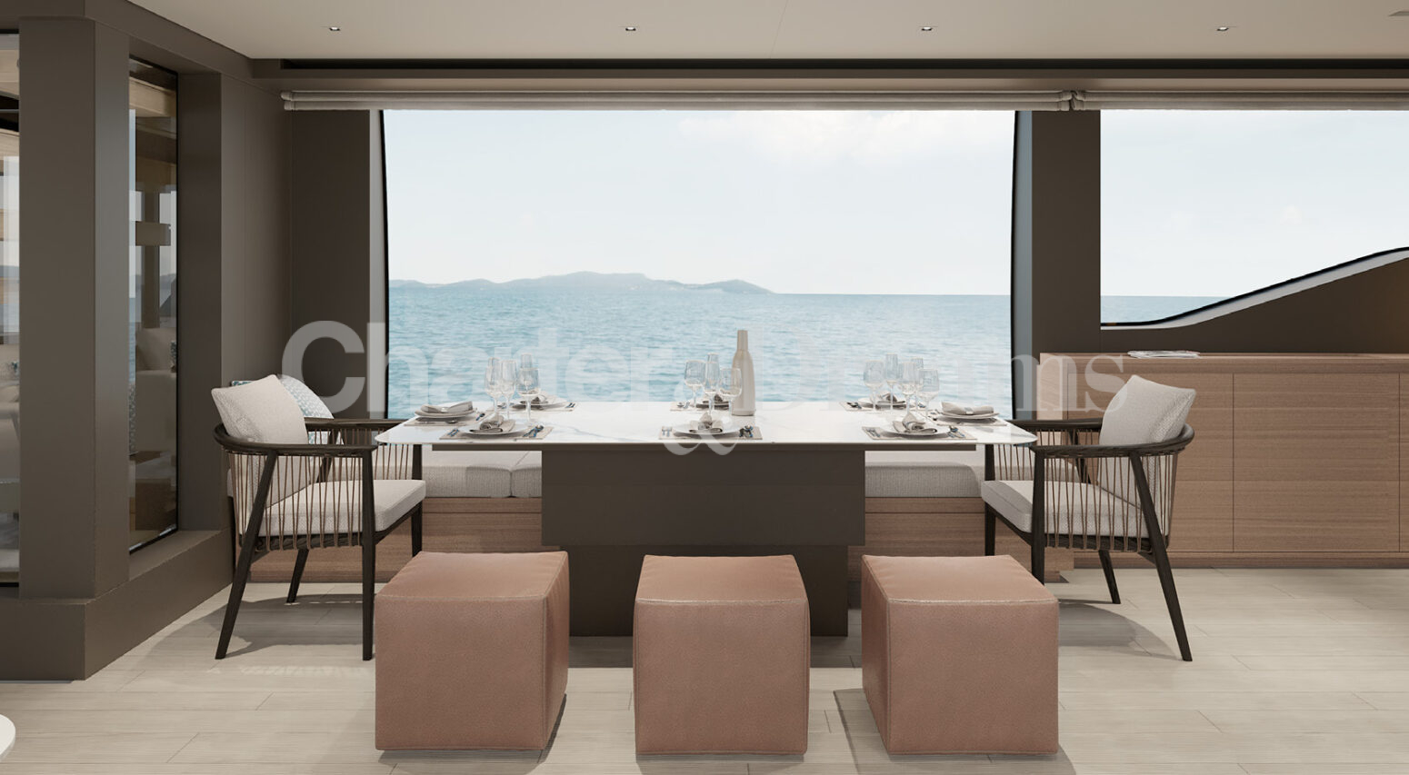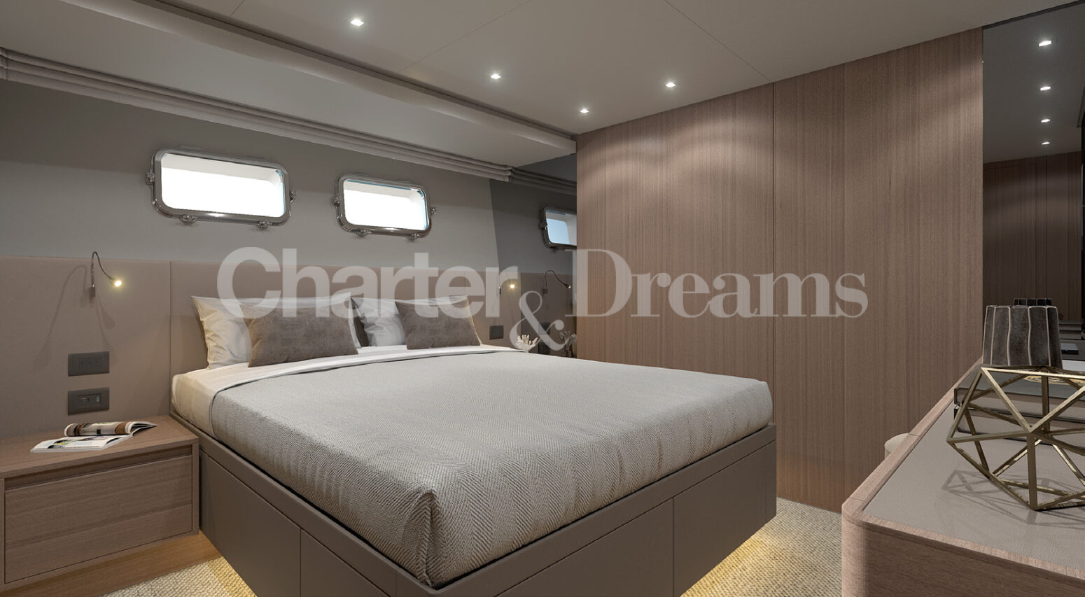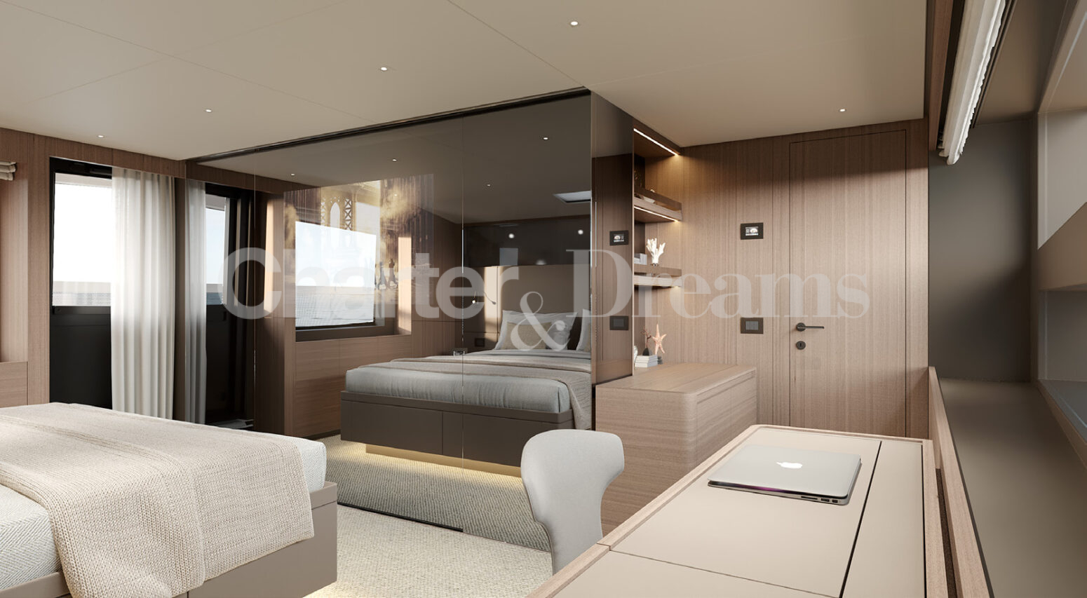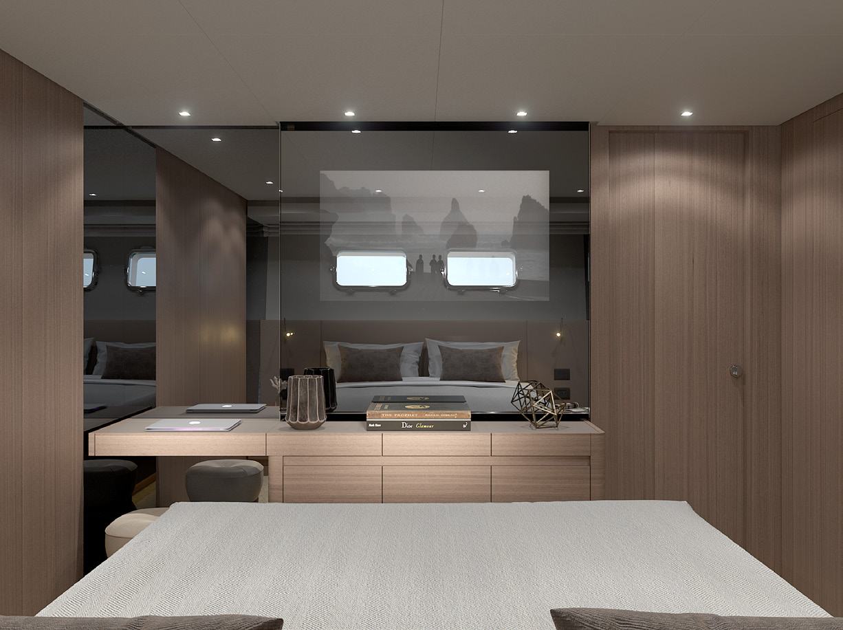 With four elegant en-suite cabins accommodating 8 guests, plus additional space for 2, Michisan combines privacy and comfort with a modern, sophisticated interior. The saloon, flooded with natural light from panoramic windows, creates a relaxed yet refined atmosphere, ideal for lounging or entertaining.