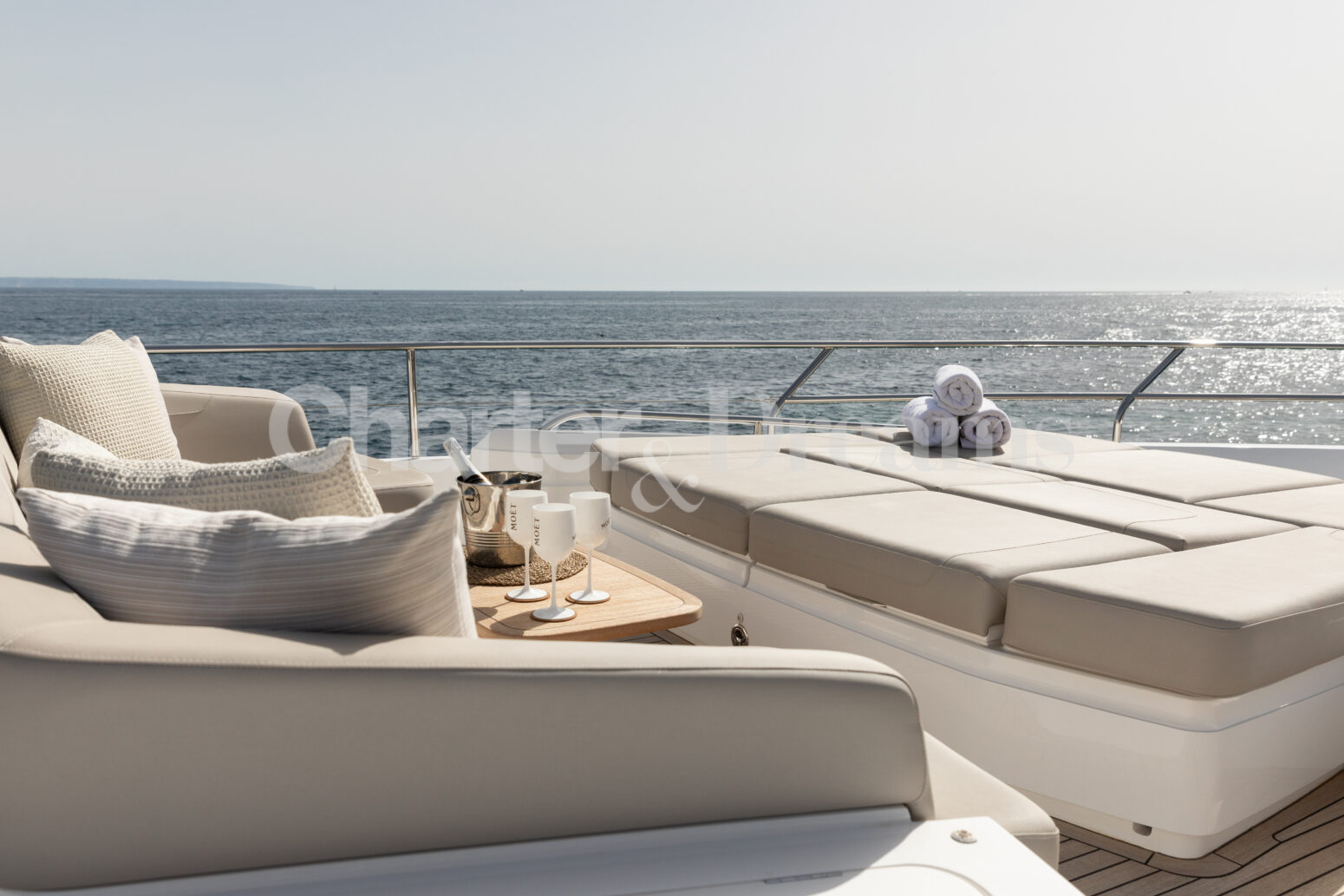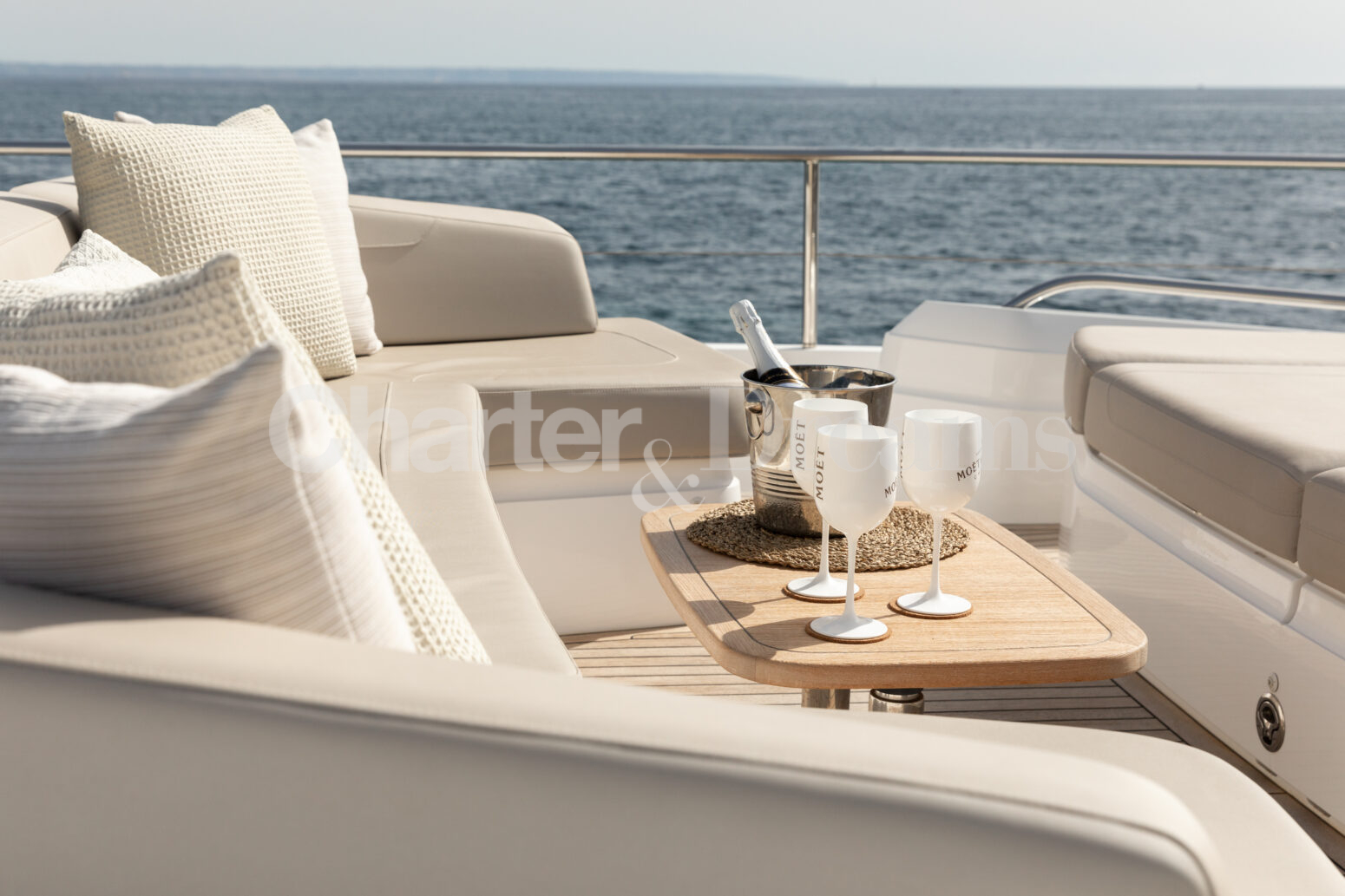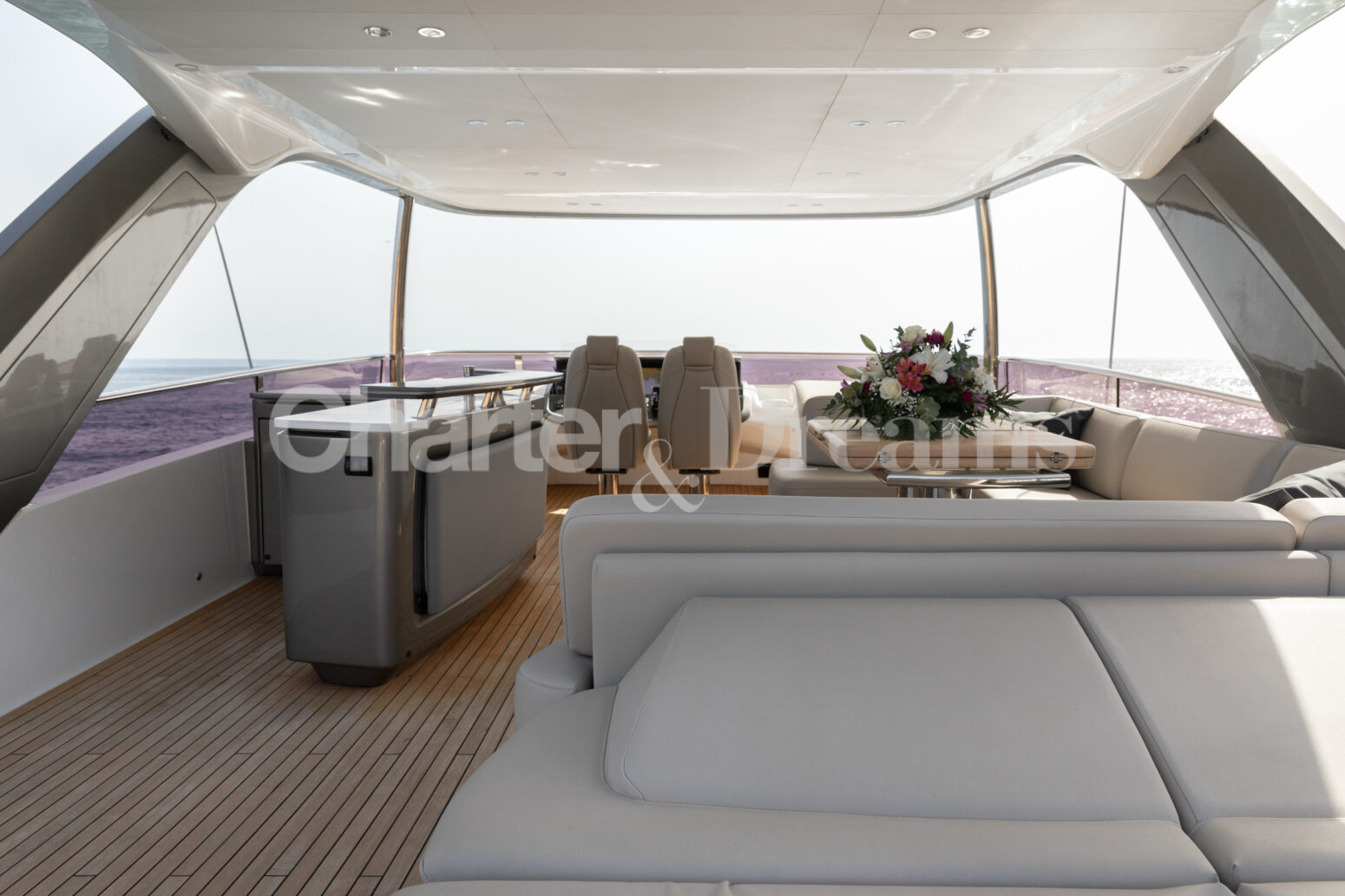 MIO BARCO II is a Princess Y78 (2020) with a bright, open layout and easy indoor–outdoor flow. The saloon combines a lounge, a large dining table, and a fully equipped galley, opening straight onto the aft cockpit. Up top, the flybridge brings a second dining area, sunbathing space, and a bar & grill, while the bow adds another lounge with sunpads.