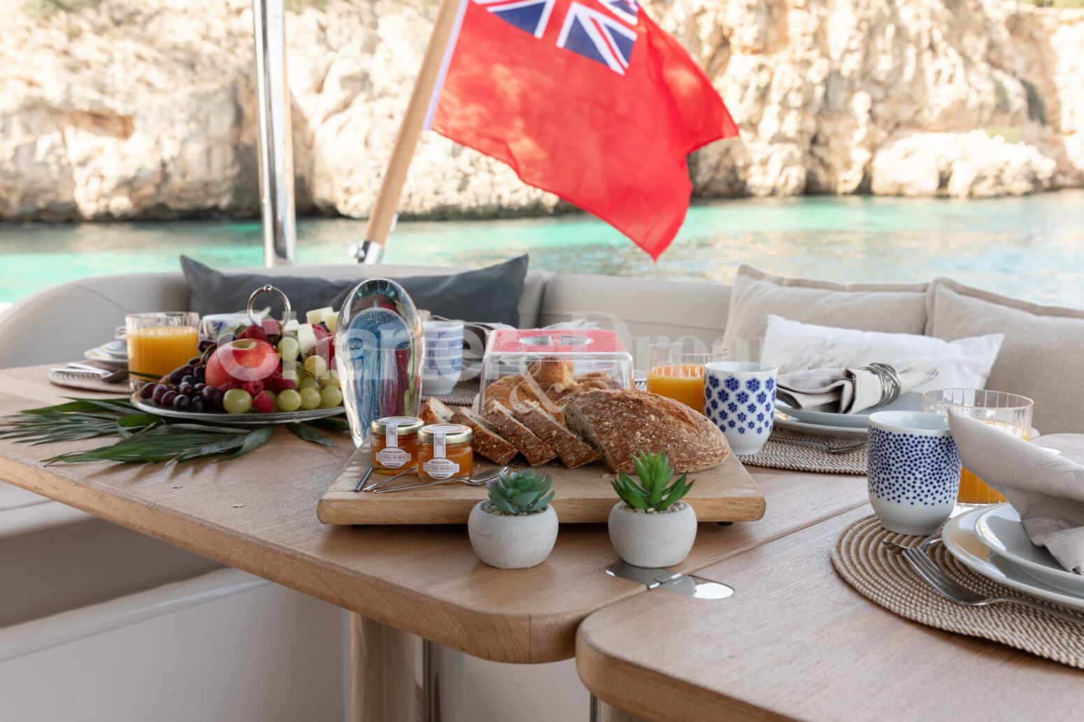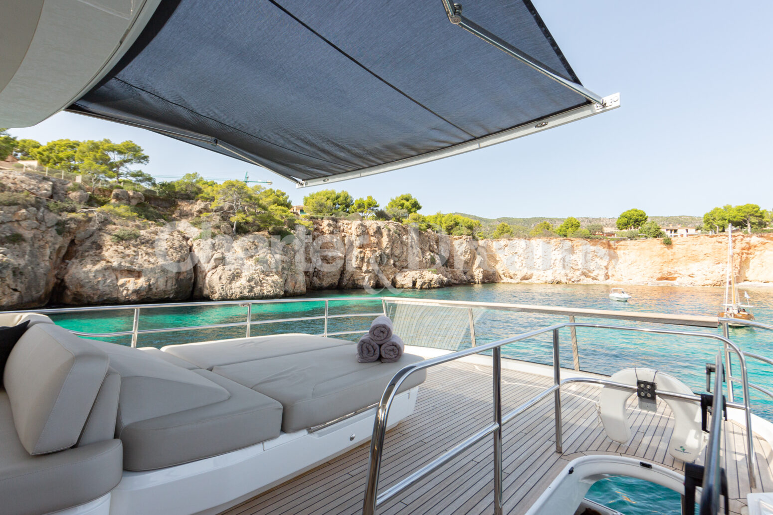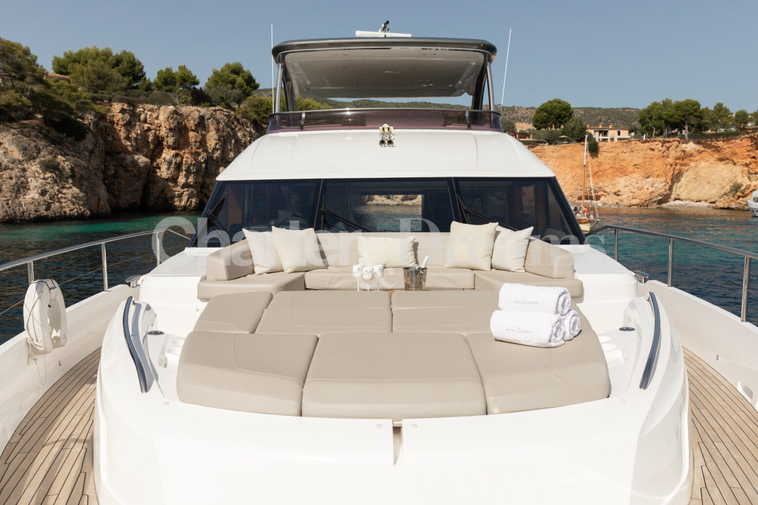 MIO BARCO II is a Princess Y78 (2020) with a bright, open layout and easy indoor–outdoor flow. The saloon combines a lounge, a large dining table, and a fully equipped galley, opening straight onto the aft cockpit. Up top, the flybridge brings a second dining area, sunbathing space, and a bar & grill, while the bow adds another lounge with sunpads.