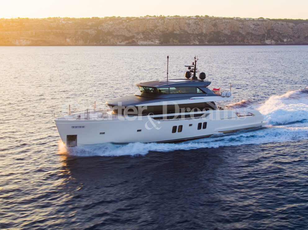 Engines: 4 x IPS3 1350SD Volvo D13 - 1000 HP - Generators: 2 x Kohler 70 KW - - Watermaker: Idromar 200 L/h - - Stabilizers at anchor: CMC - Stabilizers underway: Fins Flip Mode System - - Fuel consumption at 10kn is 77 L/h - Fuel consumption at 12kn is 167 L/h - Fuel consumption at 14kn is 238 L/h - Fuel consumption at 18kn is 482 L/h - Fuel consumption at 23kn is 745L/h (max speed) - - Fuel consumption is approximate and it depends on weather and cruising conditions at the time of the charter.