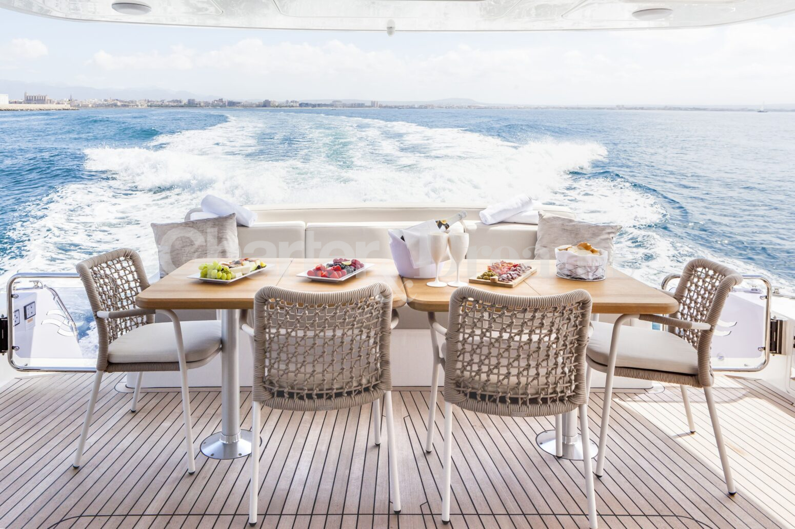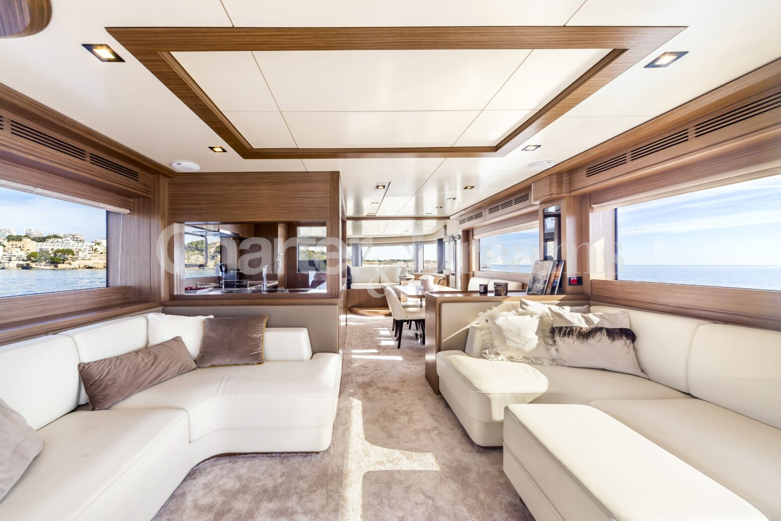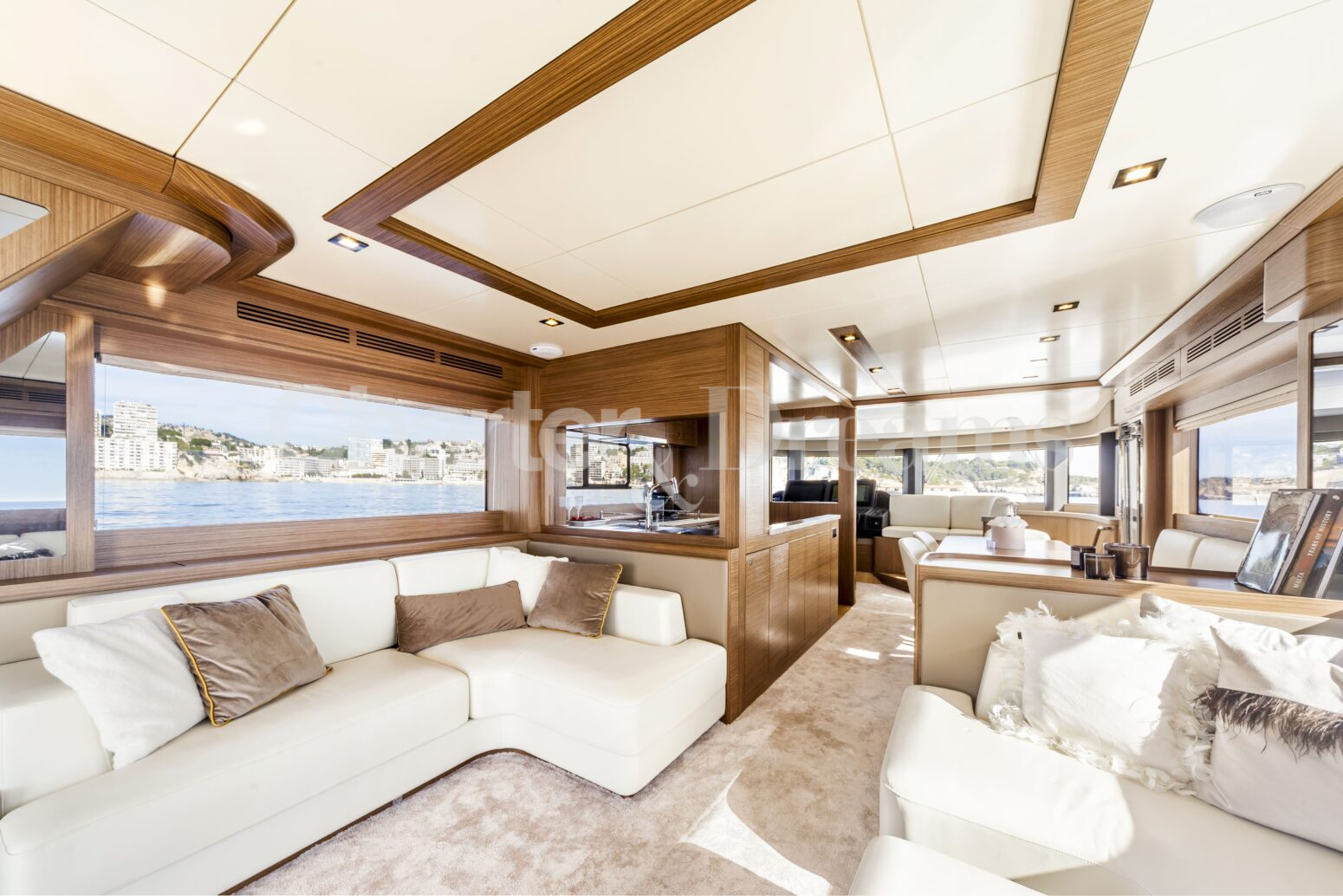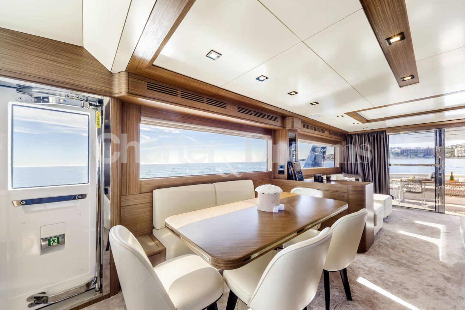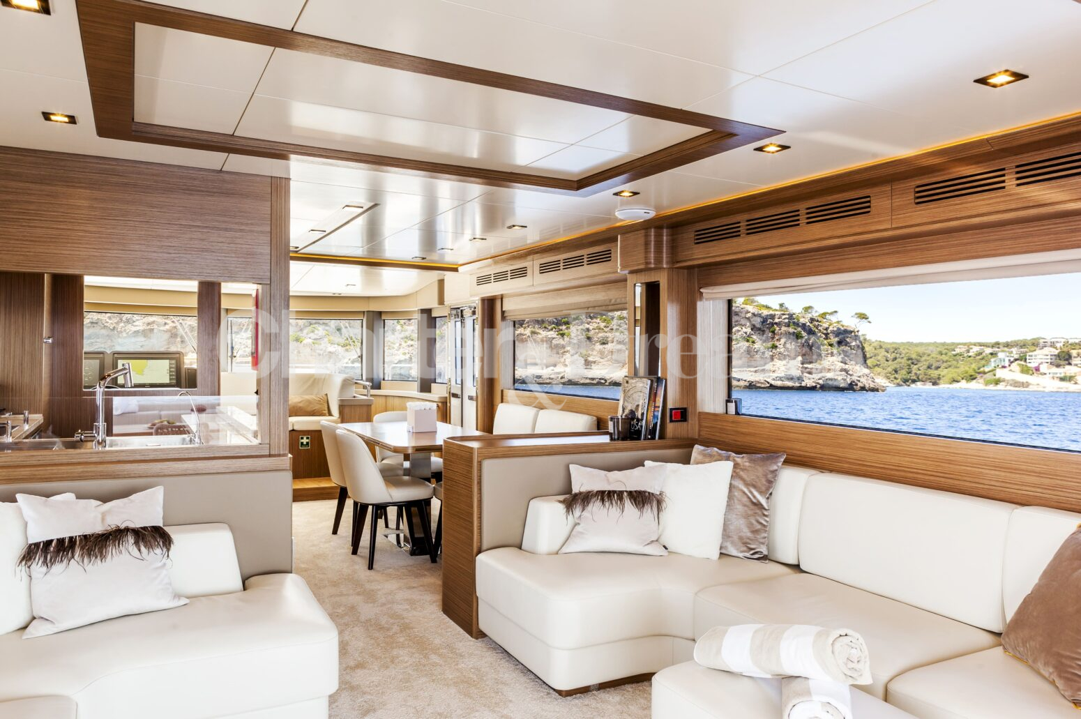 Enjoy alfresco dining on the aft deck, unwind on the spacious bow, or head to the flybridge for open-air lounging, sunset cocktails and scenic coastal cruising. Inside, the main salon is bright and contemporary, with a comfortable lounge and an indoor dining area, while Seakeeper stabilisers ensure a smooth and serene experience.