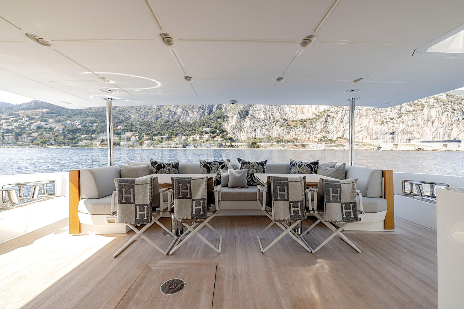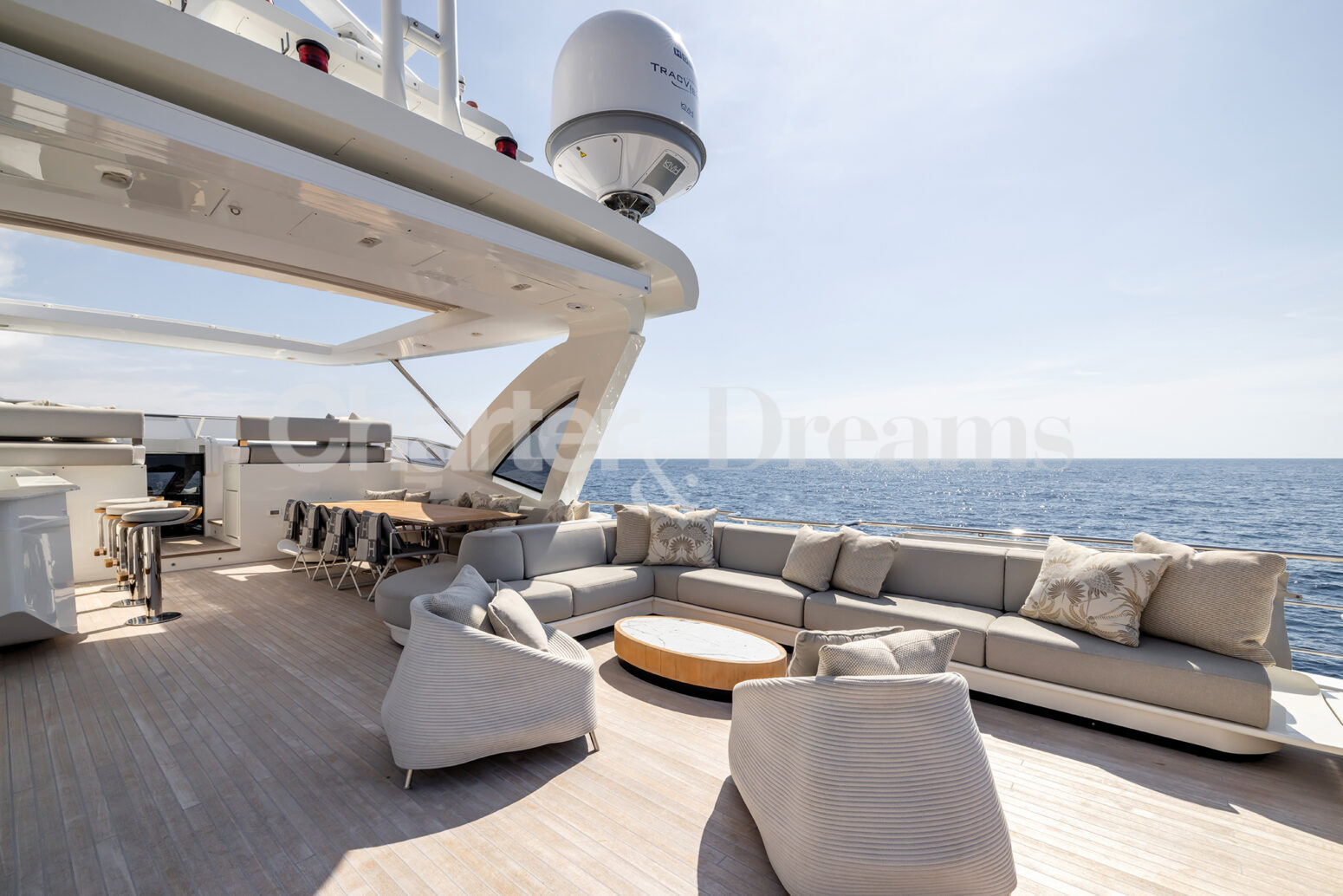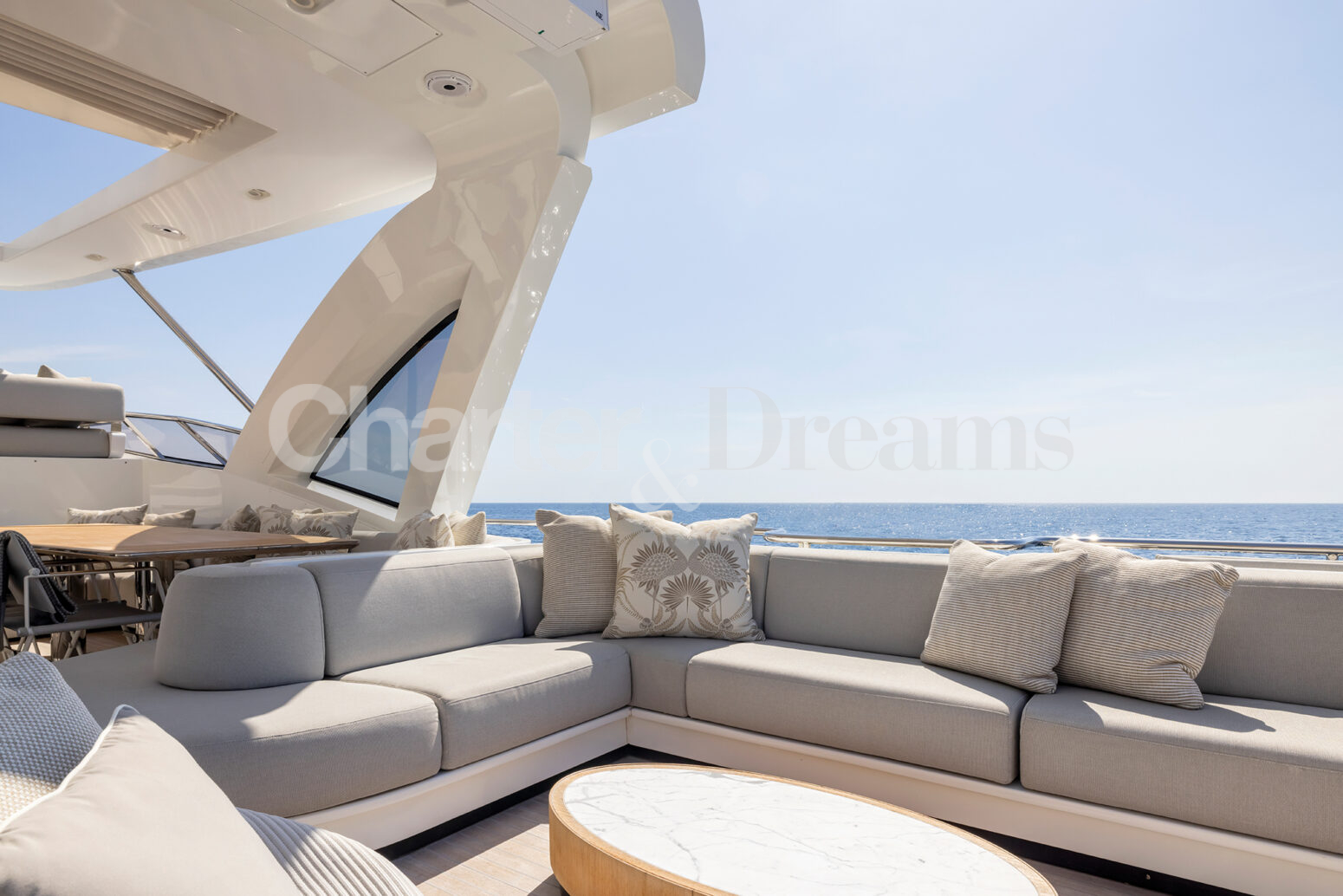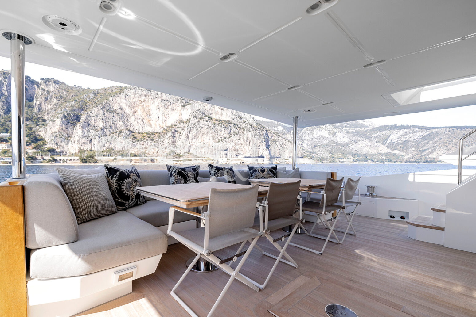 Las zonas al aire libre son un testimonio del encanto del yate, con amplias cubiertas que ofrecen vistas panorámicas y un amplio espacio para la relajación y el entretenimiento. Ya sea tomando el sol balear en el solárium, disfrutando de una comida al aire libre o realizando actividades acuáticas, cada momento a bordo promete lujo y placer.