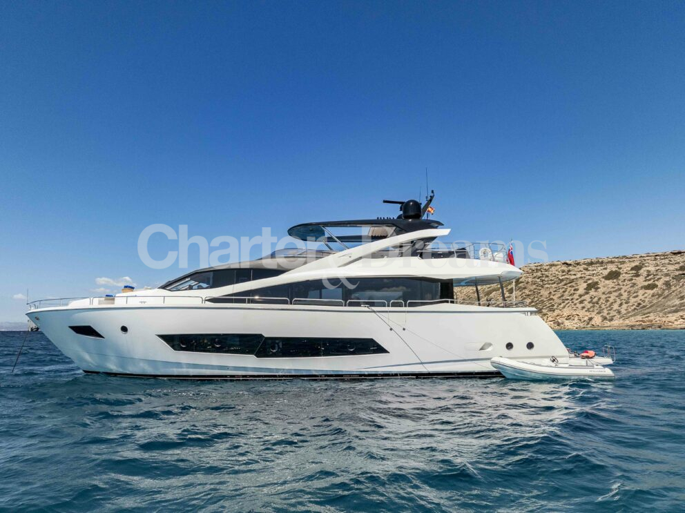 Los espacios exteriores, amplios y funcionales, invitan a relajarse, compartir comidas al aire libre o disfrutar del paisaje desde el flybridge. A nivel de ocio, se ha sumado recientemente una moto de agua a su ya completa selección de juguetes náuticos, lo que lo convierte en una opción aún más atractiva para grupos activos o familias.