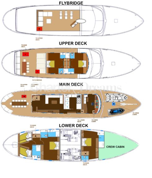 SEMAYA puede alojar hasta 12 pasajeros en 5 camarotes, todos distribuidos en un interior cálido y espacioso que invita a la relajación tras un día de navegación. Sus cuatro cubiertas exteriores permiten aprovechar cada momento del día: desde desayunos al aire libre hasta puestas de sol sobre la costa mallorquina.